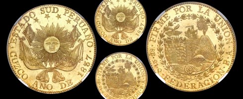 Latin American world gold coins fared especially well in the sale. Lot 206, a Cuzco, Peru, 8 escudos, 1837BA, FEDERACION type, graded by NGC as MS64+ Prooflike realized $53,550 on a $35,000 to $50,000 estimate.