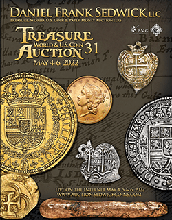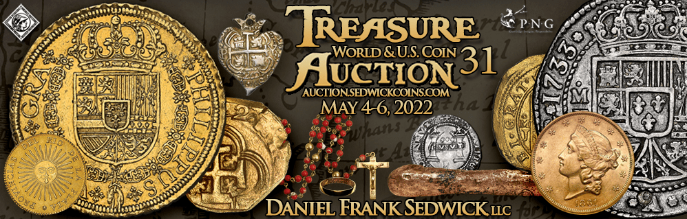 Our Shipwreck Ingots section contains several notable pieces including an impressive early New World “tumbaga” gold bar weighing 1,222 grams from the “Tumbaga Wreck” (ca. 1528) (lot 65), a beautiful gold disk weighing 216.4 grams from the 1715 Fleet (lot 69), and two cut segments of gold “finger” bars from the Atocha (1622) (lots 67 and 68). These gold bars, along with the massive silver bars and numerous coins in this sale, are sure to attract significant interest given this year being the 400th anniversary of the sinking of the Atocha and Santa Margarita on Sept. 6th, 1622 off the Florida Keys. Most notable among the section Shipwreck Coins (1500s-1650s) is the 1622-dated Seville, Spain cob 2 escudos from the Santa Margarita, which is a cover coin in Duncan Mathewson’s iconic work, Treasure of the Atocha (1986) (lot 169) along with a partially dated and graded Seville, Spain cob 2 escudos from the Atocha, plus a choice, fully dated Bogotá, Colombia cob 4 reales dated 1622 A, pedigreed to both the Atocha Research Collection and the Pat Johnson Collection (lot 164). Other important lot offered under Shipwreck coins (1660s-1740s) include a Potosí, Bolivia cob 8 reales dated 1714 Y from the pirate ship Whydah (1717) (lot 271), a large variety of reales from the ever-popular 1715 Fleet, finally under Shipwreck Coins (1750s-1900s) there is a US $20 double eagle dated 1861 from the SS Pewabic (1865) (lot 345).